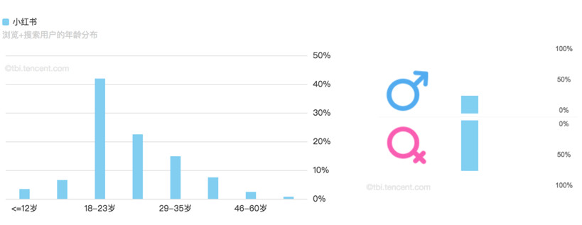 用户年龄分布主要集中在18-35岁,约占70%。其中18-23岁用户是最大使用人群,说明小红书越来越受95s欢迎。