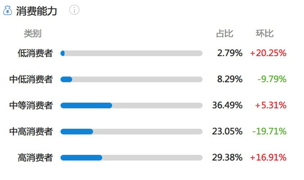 从消费能力上看,小红书用户中,中等消费者占比达36.49%,环比增加5.31%;高消费者占比29.38%,环比增加16.91%;中高消费者占比23.05%,环比减少19.71%。