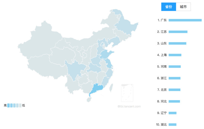 在地域分布上,小红书的用户主要集中北上广深江浙沪等经济比较发达地区,其中广东省的用户最多。