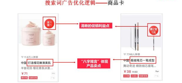 1. 商品卡的首页展现就是商品的一个头图,所以我们可以在商品的头图上面增加清晰的促销利益点,能来吸引用户的点击,在产品介绍上,可以用比较简短的语言来描述它的一个卖点。