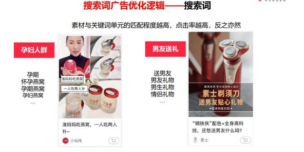 3、搜索词优化逻辑,我们建议搜索词与素材内容匹配度越高越好,这样点击率会随之变高,转化也比较好。